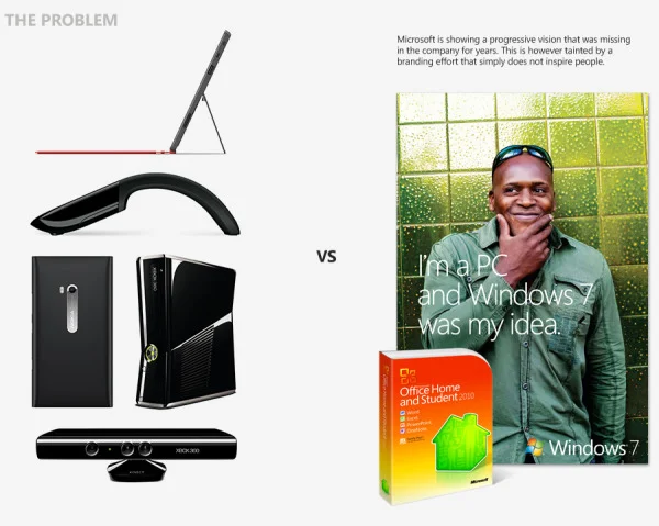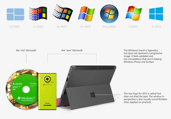 Andrew's main criticism of Microsoft's branding that for all the innovative products they are showing recently, the company has a branding effort which lacks the same message of inspiration they're trying to communicate through their visually defined product designs. The Windows logo, while a key piece of history it may be, doesn't represent a progressive product anymore, and feels rather outdated.